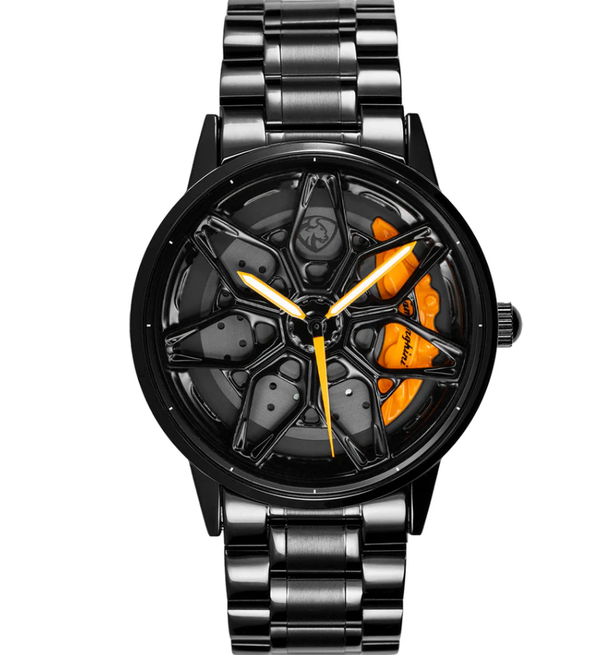 Make a bold impression with the Bellucci&Co Revuelto Wheel Watch, a striking timepiece inspired by the iconic Lamborghini Revuelto wheel design. Featuring a captivating 3D wheel-style dial safeguarded by scratch-resistant sapphire crystal, it seamlessly blends advanced durability with high-end automotive flair. Designed to stand out, this watch transforms every glance into a statement of performance and style—perfect for those who appreciate supercar-inspired luxury.