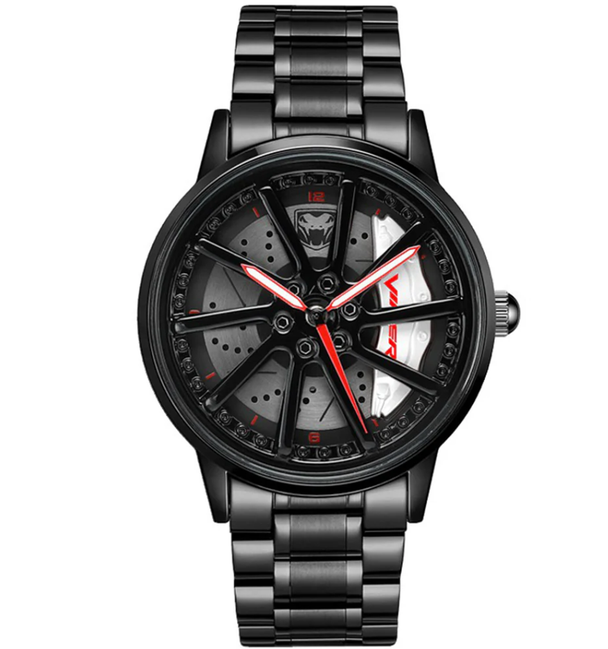 Ignite your need for speed with the Bellucci&Co Viper GTS Wheel Watch, a bold tribute to the legendary Dodge Viper. Housed in a polished stainless steel case with scratch-resistant sapphire glass, its 3D brake caliper-inspired dial delivers pure motorsport energy to your wrist. Choose from vivid red, green, or white accents to match your style. Designed for enthusiasts who crave daring aesthetics, this watch transitions effortlessly from the racetrack to everyday adventures, making a fearless statement wherever you go.